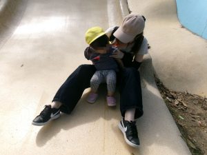 大きな石のすべりだいに親子でチャレンジ!スピード感があってスリル満点ー!