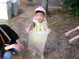お弁当タイムの後はドングリ拾いも楽しみました。「こんなに取れたよー!」