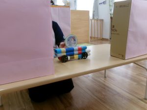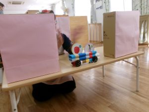 壁から壁に走る車に乗っているカードの絵は何かを当てる『目の動きを育てるトレーニング』をしました。